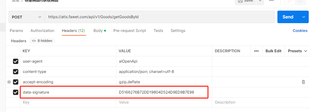 - data-signature:请求体通过md5算法生成的签名